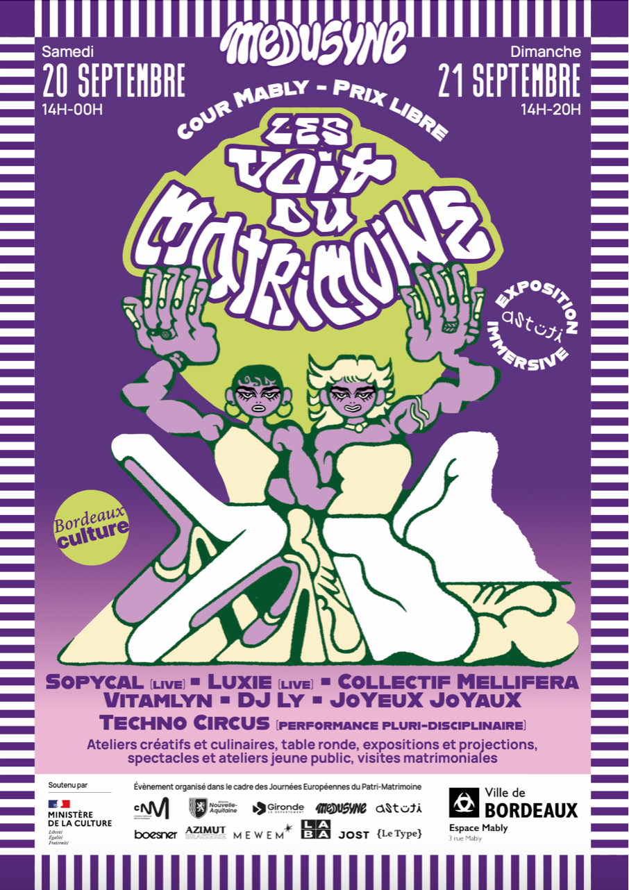 En ces Journées européennes du patrimoine, Medusyne a mis en lumière les voix féminines et minorisées dans l’histoire. Entre ateliers créatifs et culinaires, table ronde, expositions, projections, spectacles et visites matrimoniales, ce week-end a été l’occasion à la fois de célébrer et de réfléchir à ce que ces voix du Matrimoine représentent. Les concerts et DJ sets de Sopycal, Luxie, DJ Ly, Vitamlyn, Collectif Méllifera et Joyeux Joyaux, ainsi que le show drag de Techno Circus*, ont rythmé ces deux jours par leurs performances à la fois festives, engagées et inspirantes.