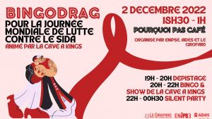 Bingo Drag – Pour la Journée mondiale de lutte contre le sida.Animée par la Cave à Kings. 18h30 – 20h Dépistages, animation et stand de prévention. 20h – 22H Bingo